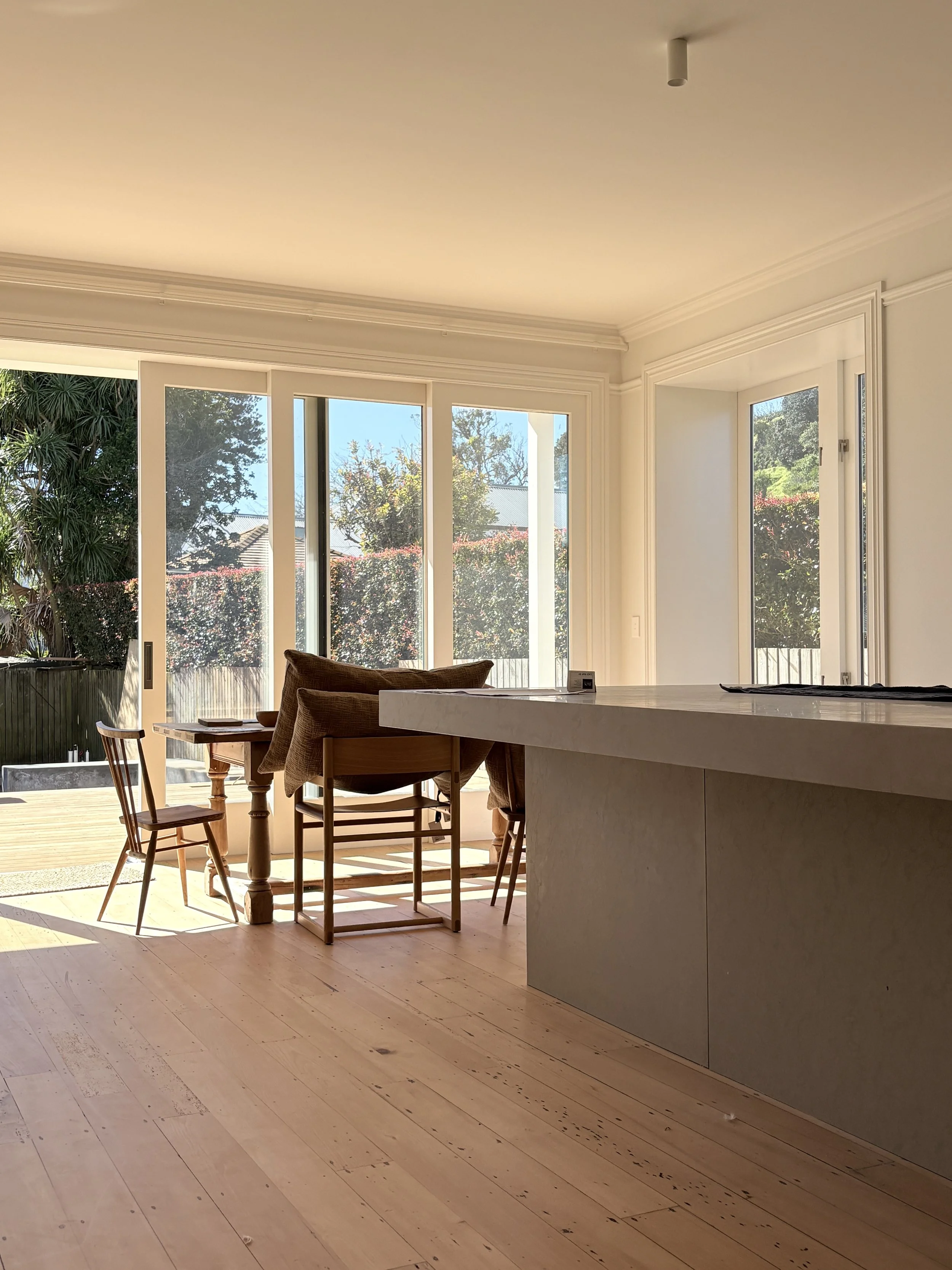 Located in the historic suburb of Devonport, this site is uniquely positioned on a narrow stretch of land between two bays. The clients had lived in the original villa while their children were young, but with the children maturing, were interested in establishing a home that could develop and evolve with them through adulthood. The design of this extensive alteration and addition clarifies the architectural language of the villa while taking cues from the local relaxed beach lifestyle - a gentle effortlessness runs through the functional and aesthetic layers. Drawing from the existing proportions and spatial relationships of the house, rationalisation and weaving of the old with the new feels subtle and understated.